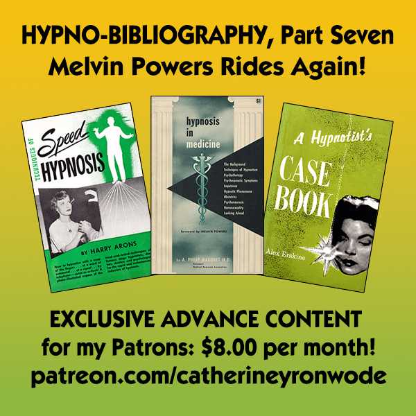 Truth to tell, when i started this bibliography in 2022 i thought it would be short but sweet, the work of two weeks at most. To my dismay, the number of uncatalogued books on my left-side desk pull-out quickly DOUBLED, as i lucked into a large stash of used paperbacks on hypnotism that were published, but not written by, the inimitable Melvin Powers, who was both a subject of, and ultimately the reason for, this work. The bibliography kept continually growing, while the pile of hypnotism books on the left-side pull-out of my desk shrank, but after two weeks of effort i had more than 20 uncatalogued books in my stack, and thanks to the assiduous work of Leslie J. Meacham (see below), i had a list of many more rare books to locate.