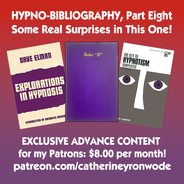 copyright 2022-2025 Hypnotism, Mesmerism, Auto-Suggestion, Hypnosis, Self-Hypnosis Bibliography is copyright 2022-2025 by the Yronwode Institution for the Preservation and Popularization of Indigenous Ethnomagicology (Y.I.P.P.I.E.), and all rights are reserved. In other words, you may download The Hypnotism Bibliography and print it out at home for your own use, but you may not further copy it, because the copyright holder controls the copying rights. Specifically, you may not mirror The Hypnotism Bibliography to other web sites, you may not distribute it or publish it in print form (either for money or for free), and you may not electronically distribute it in e-lists, electronic forums, social media groups, or usenet (either for money or for free) without the express written permission of the copyright holder.
